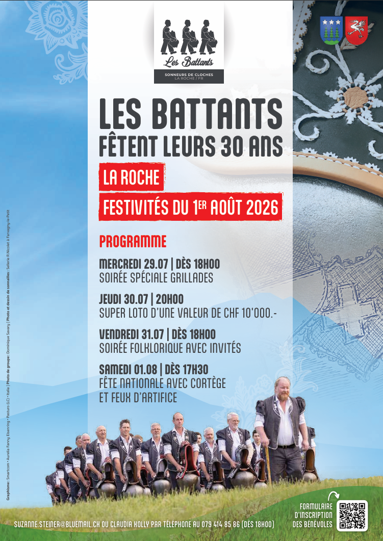 La société des « Battants, sonneurs de cloches » est une jeune société fondée en 1996 à la Roche (canton de Fribourg, Suisse). Tout a commencé lors d’un mariage d’un membre fondateur, pour lequel quelques amis c’étaient réunis pour fêter, en haie d’honneur, les noces à grand renfort de sonnailles.
